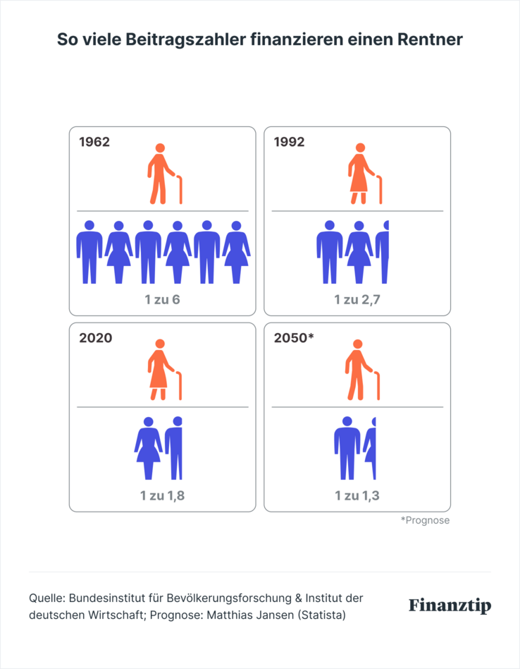 Zum Vergleich: Vor 60 Jahren kam ein Rentenbezieher auf sechs Beitragszahler. Im Jahr 2020 waren es dagegen nur noch 1,8 Beitragszahler, die eine Rentnerin versorgt haben. Die Prognose für 2030: Ein Ruheständler wird voraussichtlich nur noch von 1,5 Beitragszahlern finanziert.