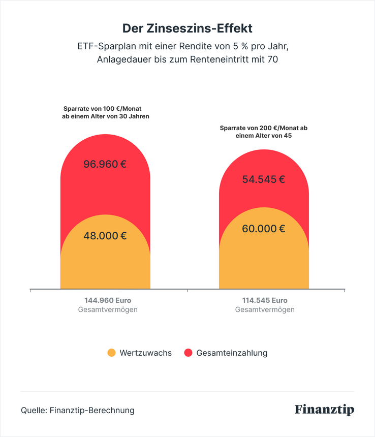 Nicht jeder hat wie Kati Monat für Monat 160 Euro übrig, um sie in die Altersvorsorge fließen zu lassen. Trotzdem hilft jeder Euro, den Du erübrigen kannst, um Deine Rentenlücke zu verkleinern. Und: Je früher Du anfängst, umso geringer ist die monatliche, finanzielle Belastung. Denn Du bringst mehr Zeit bis zur Rente mit, profitierst länger vom Zinseszins und sitzt mögliche Schwankungen am Aktienmarkt einfach aus.