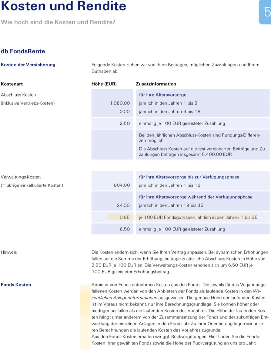 Nachdem ich nun seit einem Jahr etwa - nicht zuletzt über Saidi - über Kündigung der Lebensversicherungen zum Vermögensaufbau mit ETF-Sparplänen gekommen bin und ich mich mittlerweile gern und regelmäßig mit dem Thema beschäftige, gilt meine Frage heute dem Sparkonzept der Deutschen Bank db FondsRente, das eine Bekannte abschließen möchte (risikobehafteter Anteil, Zeitraum 18 Jahre, 1000,- monatlich., Auszahlung nach Ende der LAufzeit, keine Rentenzahlung). Risikoarmer Anteil ist separat als Festgeld angelegt.