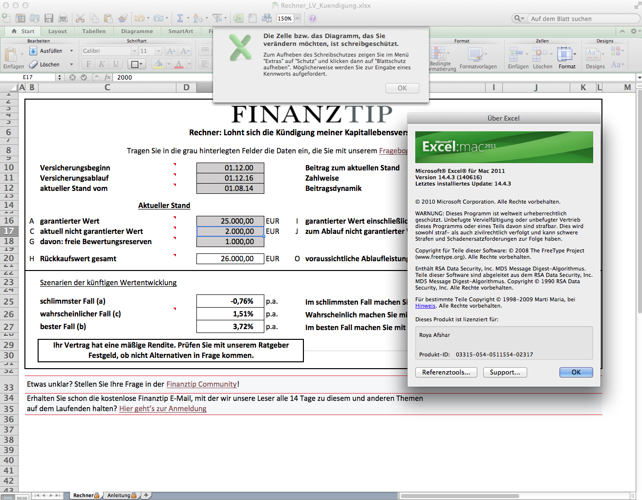 trotz mehrmaliger Downloadversuche (der alten Excel-Version) klappt es bei mir mit dem Excelrechner nicht. Ich habe über den Fragebogen die entsprechenden Daten von meiner Versicherung, der debeka, bekommen, sobald ich aber im Feld E10 das Datum des Versicherungsablaufs eingebe, geht die Berechung in den Feldern unten "kaputt" und es erscheint dort überall nur "Wert" oder (rechts) "Name". Was mache ich verkehrt? Es fehlt ja auch das Tabellenblatt "Berechnung"...