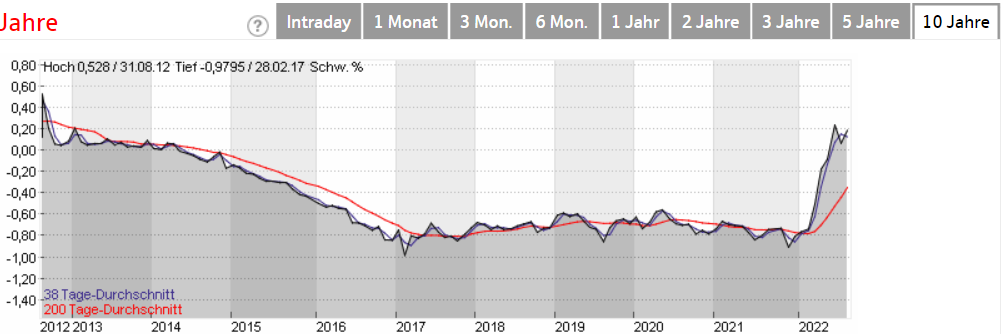 Die Renditen waren jahrelang zwischen -0,8% und -0,6%, sind plötzlich auf über +0,4% gestiegen (wie vor 10 Jahren) und zuletzt wieder auf 0,2% gefallen.