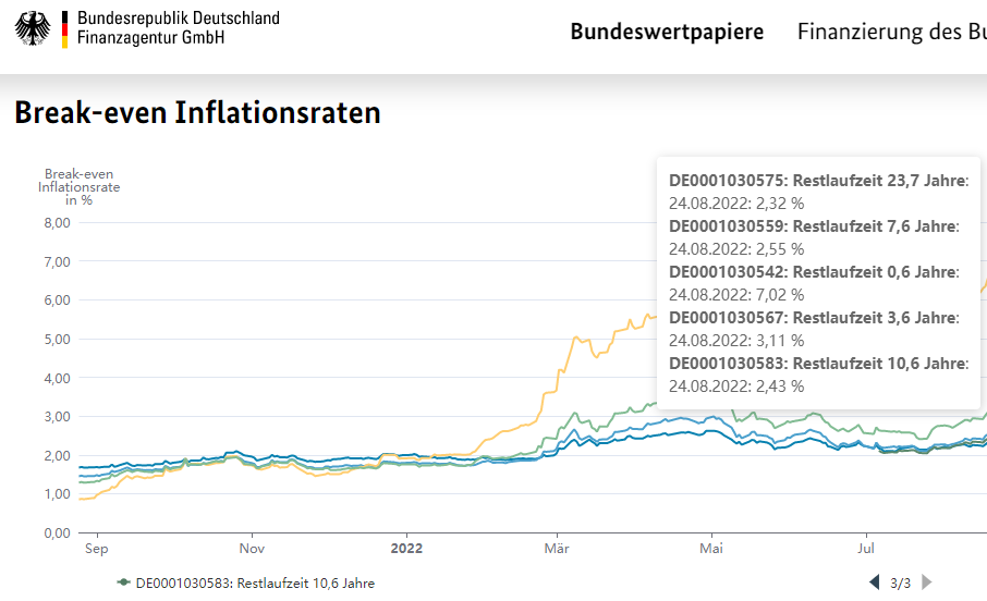 ZitatFür die USA wird die Breakeven-Inflation über bestimmten Restlaufzeiten bequem und bürgerfreundlich auf einer Website der US-Zentralbank publiziert, nämlich hier. Für Deutschland existiert eine solche öffentlich zugängliche Informationsquelle unseres Wissens nicht.