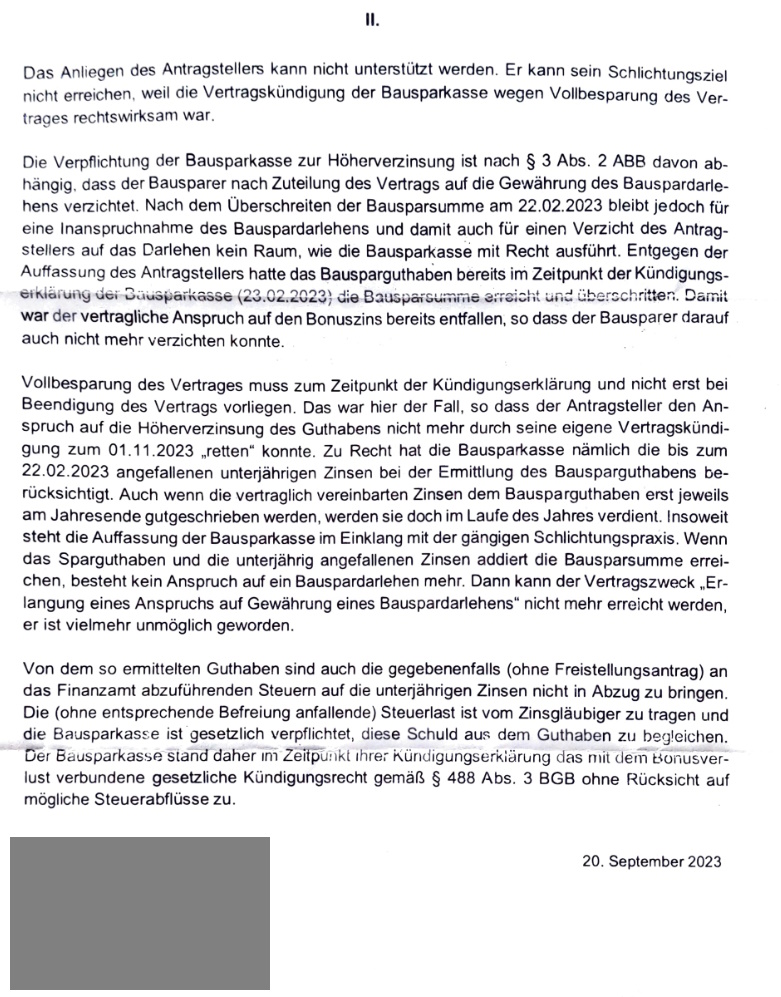 steht die Auffassung der Bausparkasse im Einklang mit der gängigen Schlichtungspraxis. Wenn