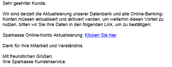 Bei der E-Mail handelte es sich nicht um eine echte Nachricht des Unternehmens, sondern um eine sogenannte Phishing E-Mail. Die Absender ahmen E-Mails von Banken, Versicherern und anderen Unternehmen nach. Sie versuchen, an sensible Daten der Empfänger zu kommen.