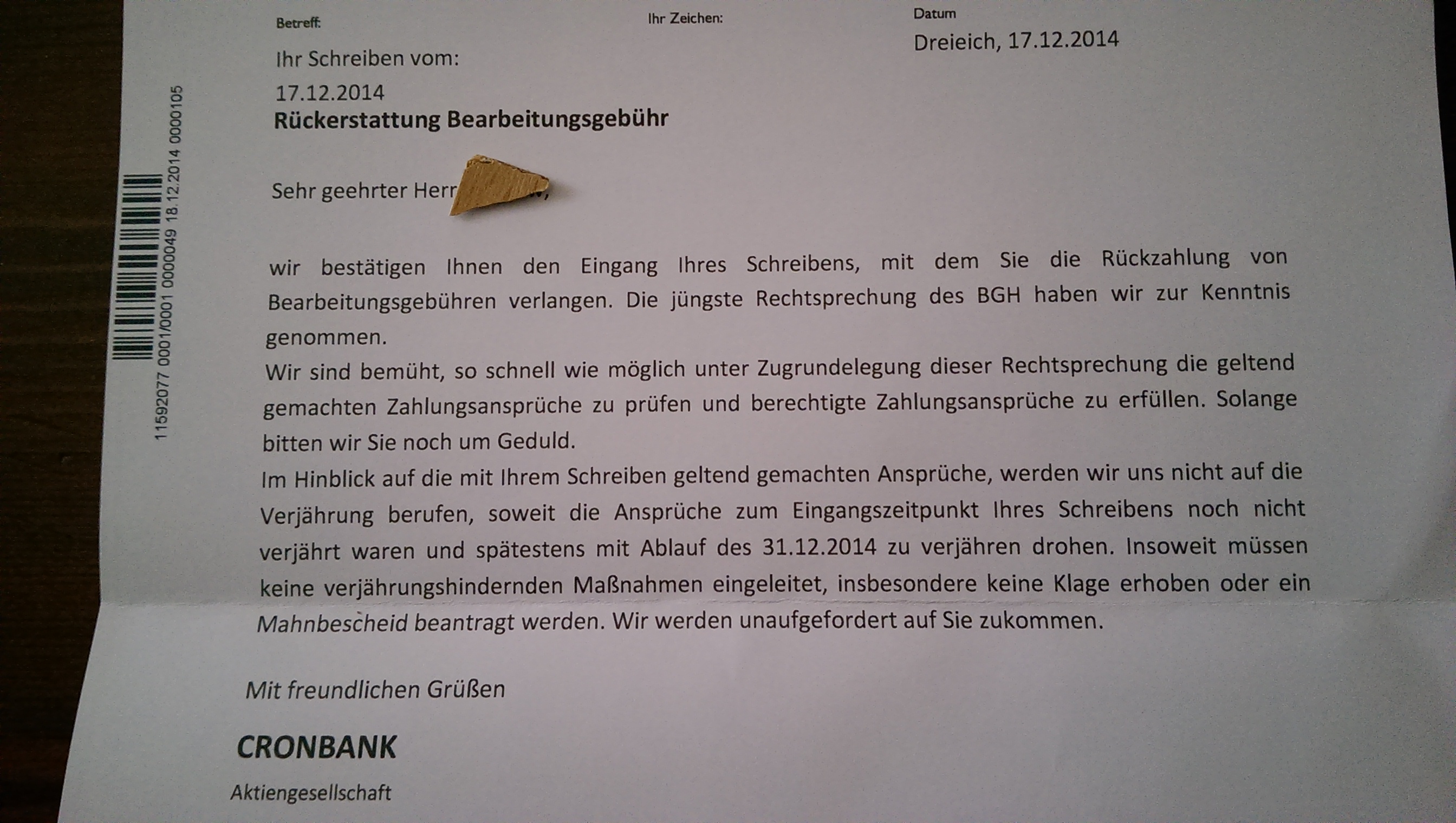 Gestern kam das erste Antwortschreiben von der cronbank...siehe Bild....was ist davon zu halten?