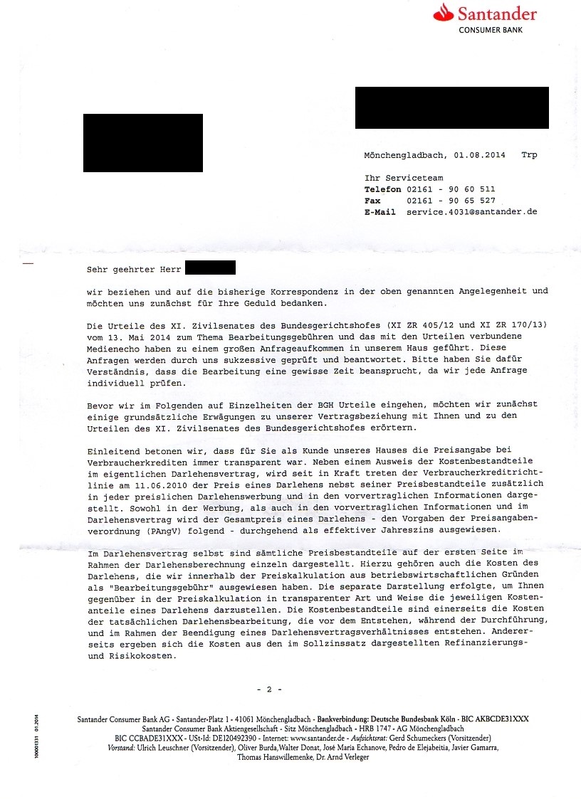 Vorgestern kam der Brief mit der Ablehnung der Santander und Berufung auf BGB. Musterbrief wie man deutlich an der gedruckten Unterschrift erkennt.