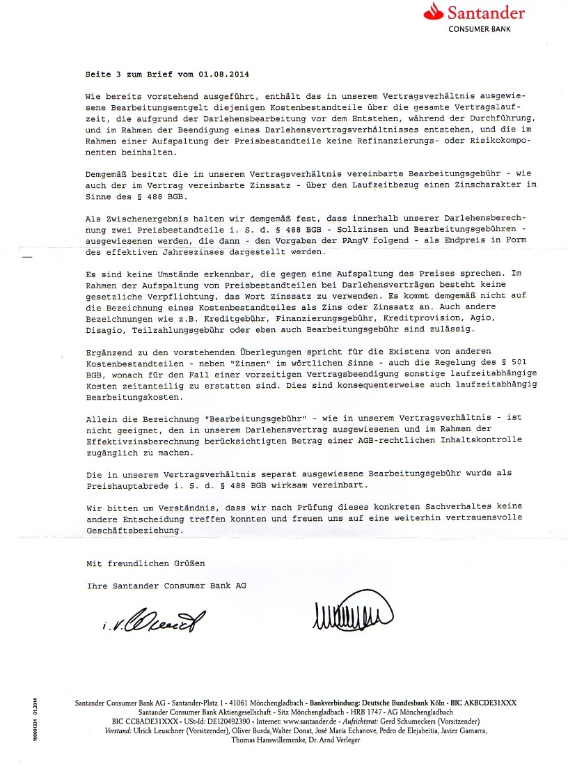 Vorgestern kam der Brief mit der Ablehnung der Santander und Berufung auf BGB. Musterbrief wie man deutlich an der gedruckten Unterschrift erkennt.