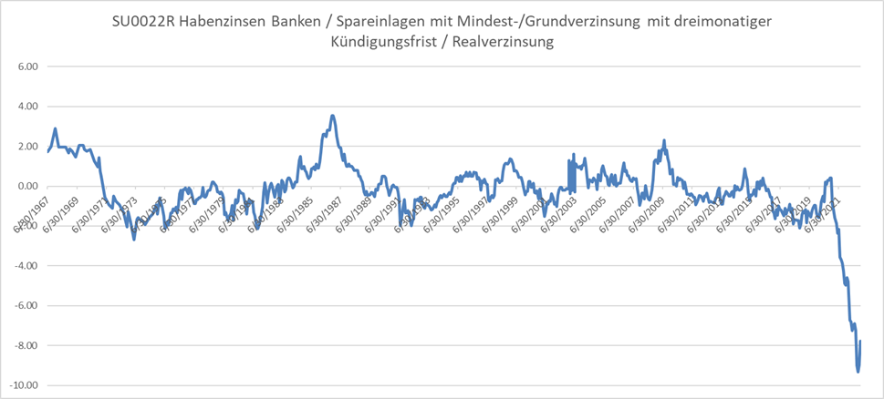 Es gab gewisse Phasen mit negativen Realzinsen, nur lagen diese dann mit 0,5 oder 1,0 Prozent bzw. maximal mit 2,0 Prozent im Minus - und nicht wie nunmehr mit sieben, acht oder neun Prozent im Minus (wenn man, wie in der Grafik, Spareinlagen mit dreimonatiger Kündigungsfrist als Referenzwert nimmt). Die Dimension ist also inzwischen eine ganz andere geworden.