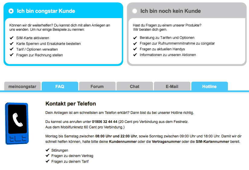 Congstar wohl das einzige Telekommunikationsunternehmen sein, das selbst über keinen erreichbaren Kunden-Telefonanschluss (Hotline) verfügt.Vorsicht auch bei den (angeblichen) Preisen der Produkte: Nach Abschluß meines Vertrages wurde auf die im Internet