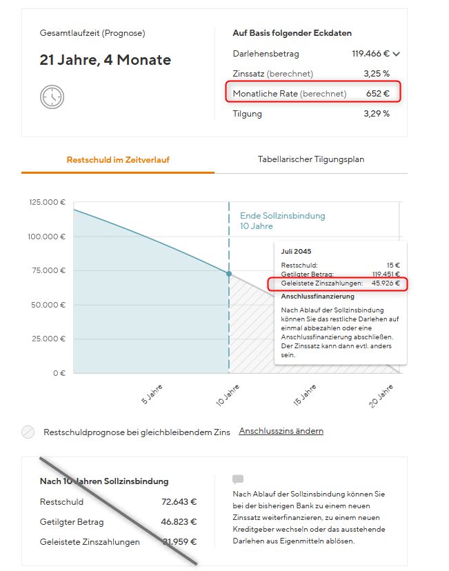 Aus B ergbit sich, falls ungeplantes dazwischen kommt, einfach die 650er Rate fortzuführen, ohne Sondertilgung. Diese Endet ca. mit meinem Renteneintritt.