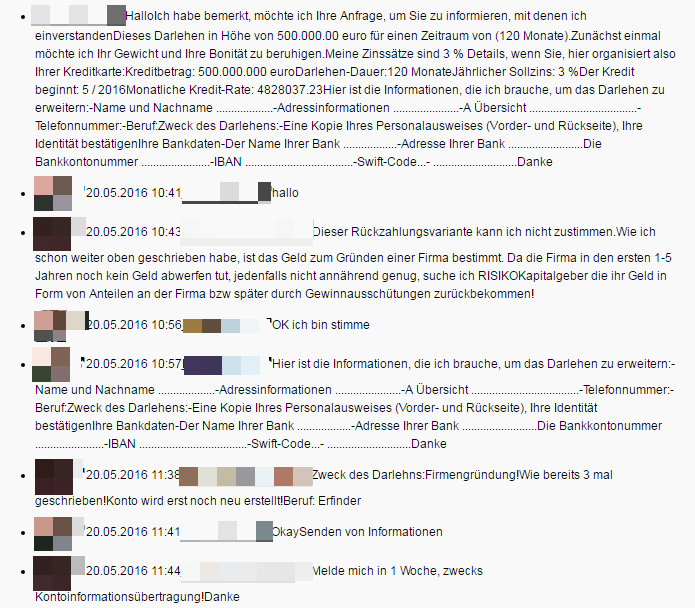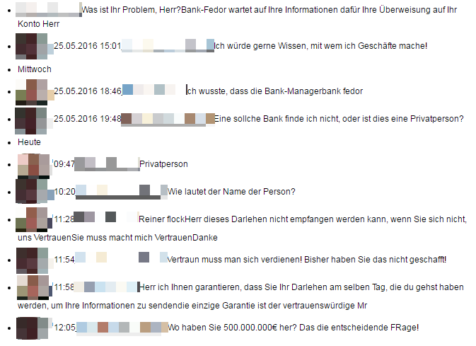 Ein Leser hat mich auf einen Kredit-Bot aufmerksam gemacht (anbei die Unterhaltung, die von Facebook kopiert ist). Hattet Ihr es schon einmal mit einem Bot zu tun? Wenn ja, wie schnell habt Ihr gemerkt, dass da etwas nicht stimmen kann?
