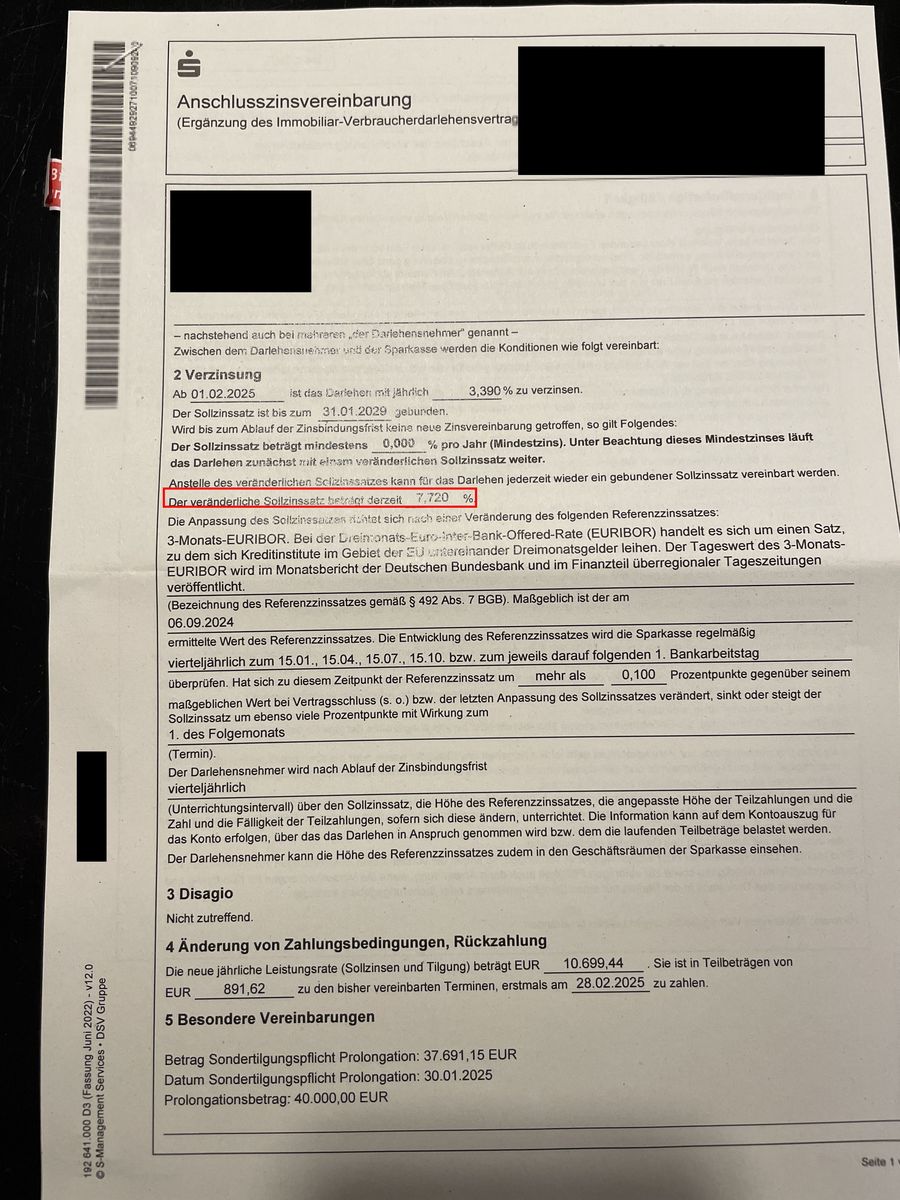 Aber ansonsten bleibt der Zins bis 31.01.2029 fix bei 3,39% und wen absehbar doch noch eine Rest schuld offen ist, einfach Ende 2028 mal den aktuellen variablen Sollzins bei der Sparkasse anfragen.