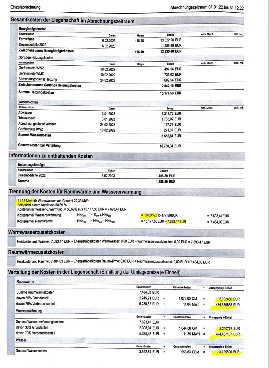 Ich versuche die Nebenkostenabrechnung 2022 und dort insbesondere die Abrechnung des Dienstleisters Thermomess zu verstehen.