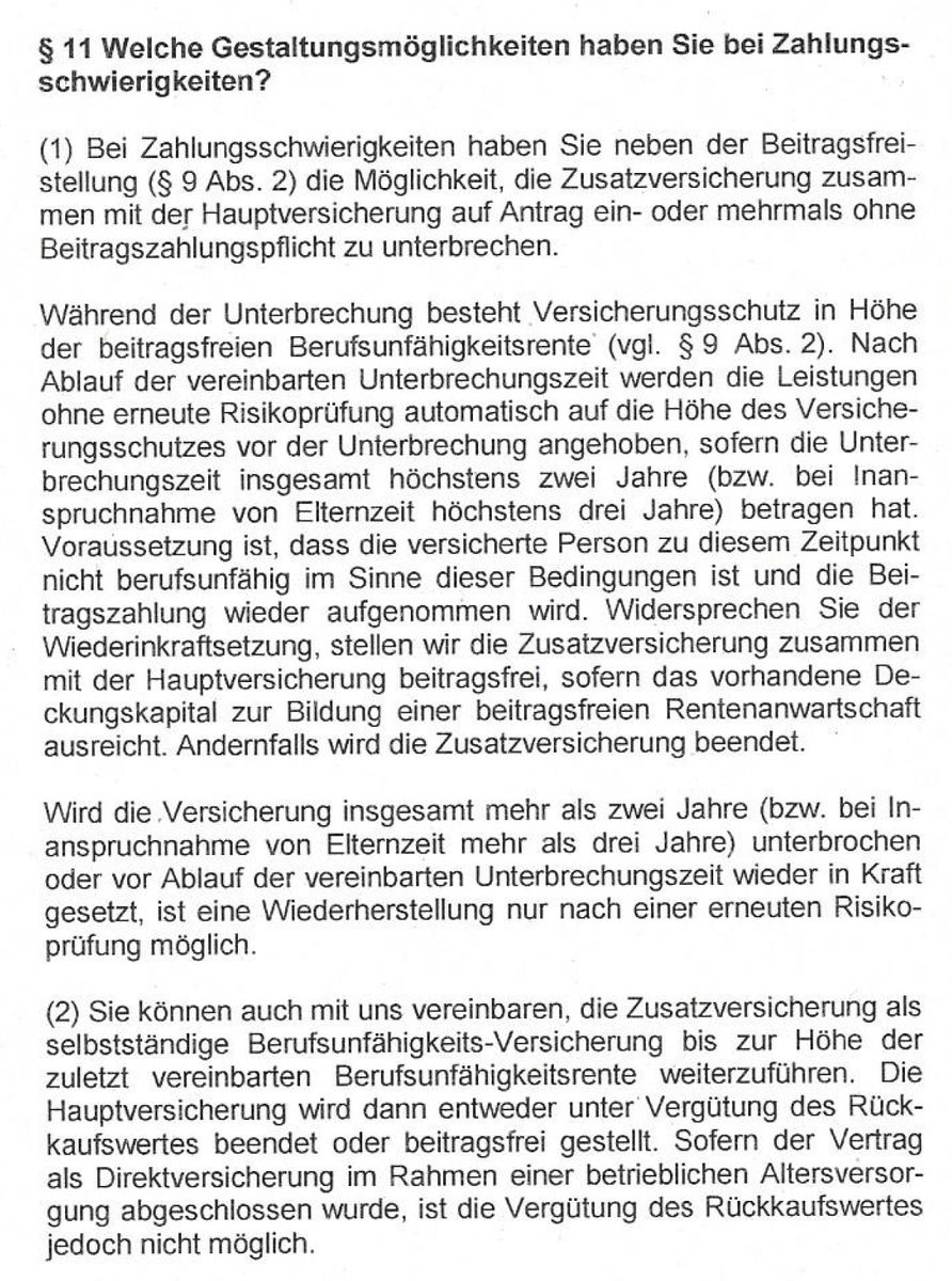 Monetenmatrose und Hoqqa aus dem anderen Thread: Ich hab wg. meiner Vertragsumstellung/Herauslösung der BU der Debeka zu Hause jetzt nochmal geschaut. Die für euch m.E. relevante Passage stand zumindest bei mir (damals als Teil einer Gesamtversicherung Namens "A1A" aus dem Jahr 2012) in den "Allgemeinen Bedingungen für die Berufsunfähigkeitszusatzversicherungen BUZ-T - 01/2012". Diese Tarifbedingungen braucht ihr und darauf solltet ihr euch beziehen, wenn ihr die Herauslösung der BU/DU aus so einem Vertrag durchsetzen wollt. Bei mir heißt es in den Tarifbedingungen versteckt in §11 (2):