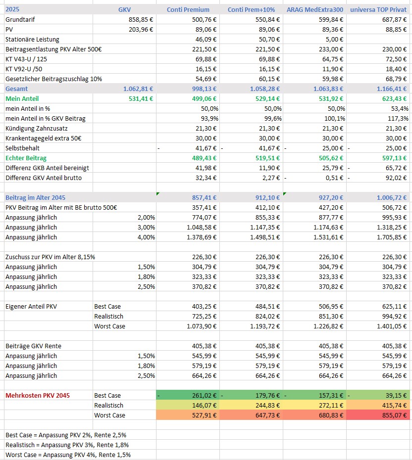 Konkret habe ich Angebote vorliegen, Continentale Premium, BE-Tarif 500 EUR, KT 150 EUR für 995 EUR. Davon entfallen 220 EUR bereits auf den Beitragsentlastungstarif, Nettoerstattung also 280 EUR ab dem 65. Lebensjahr. Alternativen ARAG MedBest 300 und universa Top Privat 300. Die Tarife haben alle Besonderheiten und ja, es gibt nicht den optimalen Tarif. Der Conti Premium wurde seit 2022 nicht mehr angepasst, hier gehe ich von 10% Steigerung für 2026 direkt aus. Die ARAG hat aktuell für 2025 mehr als 10% erhöht, der MedBest war vorher ein echter Preis-Leistungstipp.