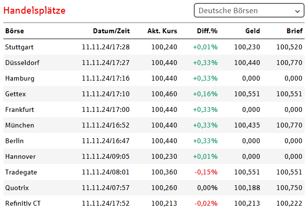 Die aktuellen Brief-Kurse für verschiedene Börsen stehen in der rechten Spalte: