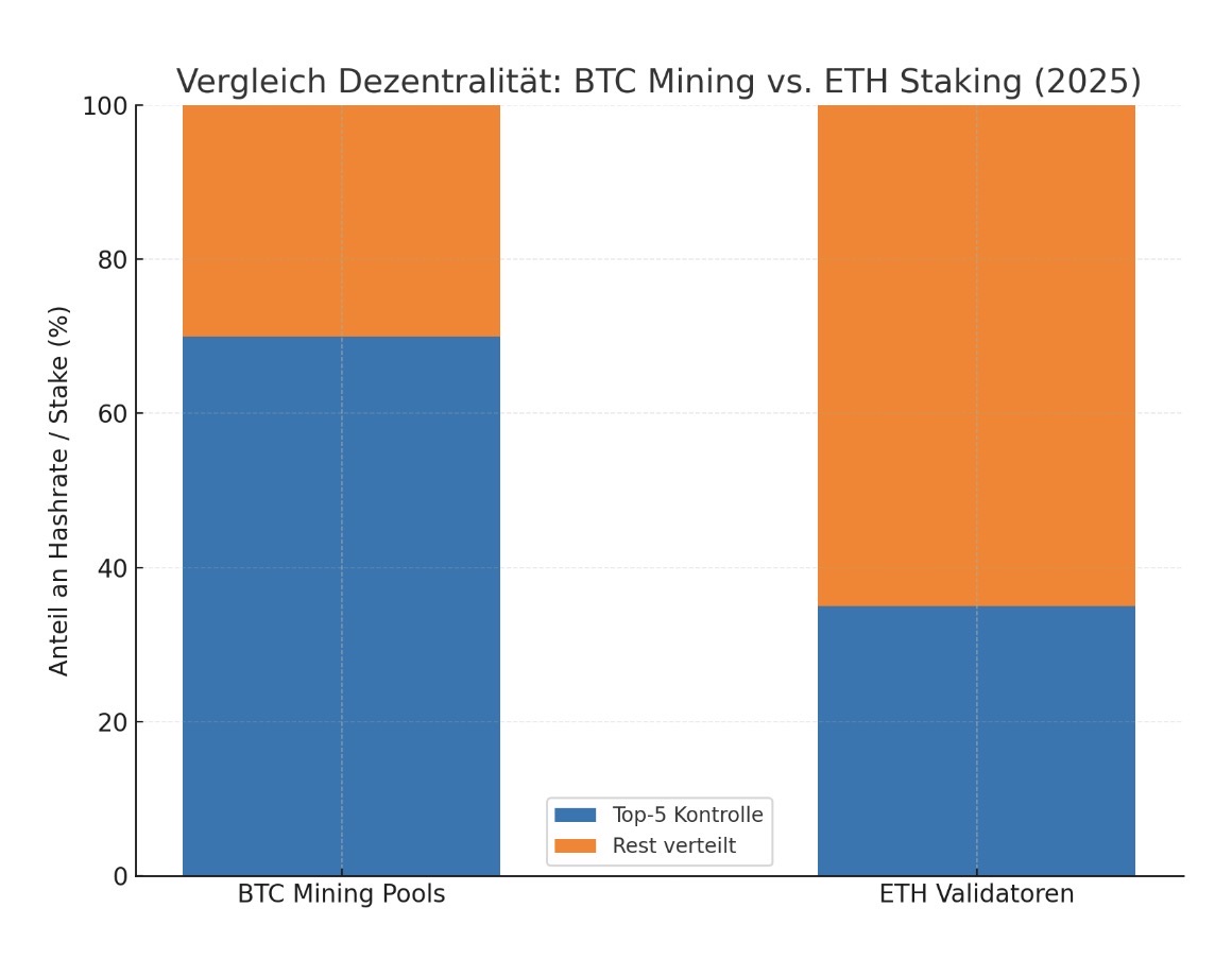 Bei Proof-of-Stake bleibt Macht dauerhaft in den Händen derjenigen, die bereits besitzen. Es gibt keinen natürlichen Marktmechanismus wie bei Bitcoin, der über Anreize zur kontinuierlichen Effizienzsteigerung führt. Bei PoW misst du dich permanent mit dem Markt, musst deine Infrastruktur verbessern oder wirst verdrängt. Bei PoS reicht es, früh genug Coins zu besitzen – und dann kannst du im Zweifel ewig passiv profitieren, ohne dass sich dein Anteil jemals verringert. Das Resultat ist langfristig unausweichlich: Zentralisierung.