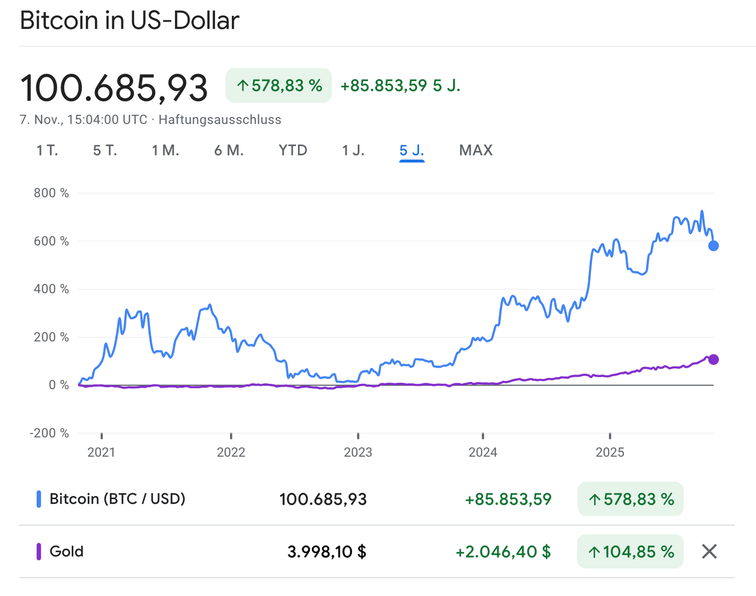 Korrigiere mich, wenn ich falsch liege, aber hat Gold nicht allein in den letzten 5 Jahren rund 500 % schlechter performt als Bitcoin? Das muss Gold erst einmal aufholen. Wir stünden dann bei einem Goldpreis von rund 20.000 $.