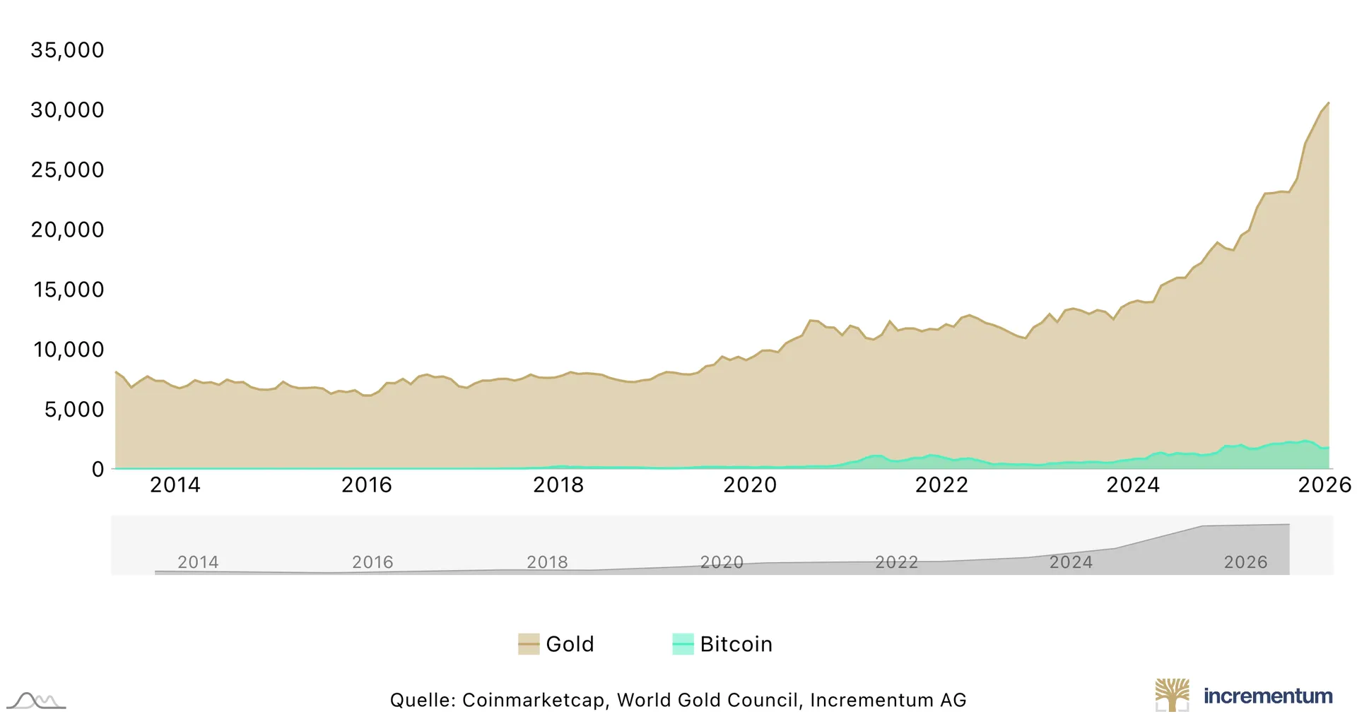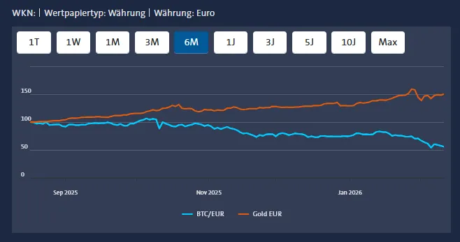 Fun Fact: 2015 lagen Gold (1 Unze) und Bitcoin (1 BTC) beide bei ungefähr 1.000 Dollar. Heute steht eine Unze bei rund 5.000 Dollar, Bitcoin bei etwa 70.000 Dollar. Da hat sich die Dynamik doch deutlich unterschiedlich entwickelt – da müsste Gold schon einiges aufholen.