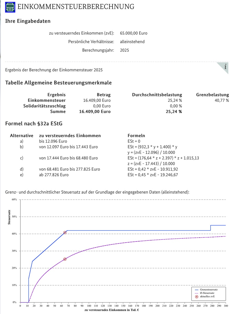 Alles anzeigenDein persönlicher Steuersatz, sprich Einkommensteuer, liegt bestimmt irgendwo oberhalb der 25% (siehe Bilder unten ⬇️ ), der Grenzsteuersatz, also das womit ein hinzukommender Euro an Einkommen beteuert wird, liegt ab ca. 24000 € zVE oberhalb der 25%. Ja (Günstigerprüfung und so hilft hier), bis Du im Durchschnitt bei über 25% landest, also aufs gesamte Einkommen, dauert bis etwa 65.000 € zVE.