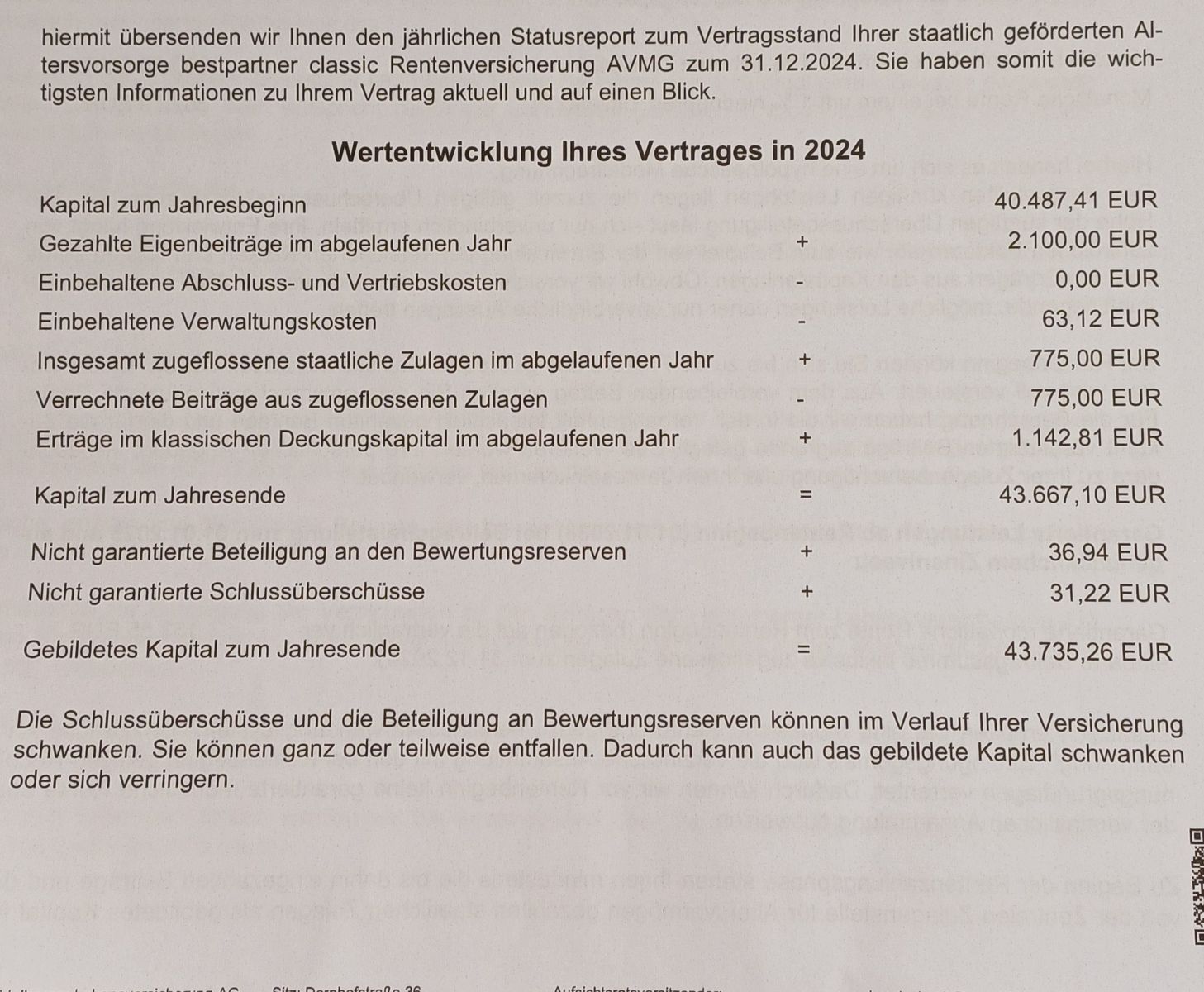 2004 noch haben wir beide eine Riesterversicherung abgeschlossen und regelmäßig eingezahlt. Auf meinen Vertrag kommen die Zulagen für zwei Kinder, die aber schon 15 und 17 sind. Der Vertrag hat eine garantierte Verzinsung von 2.75%.