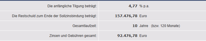 Nach nur 10 Jahren zu 3,45% bei gleicher Rate sieht das Bild wie folgt aus - es wurden gerade mal 85.000 EUR getilgt, es wurden 112.000 EUR Zinsen gezahlt, es bleiben fast 280.000 EUR Restschuld.