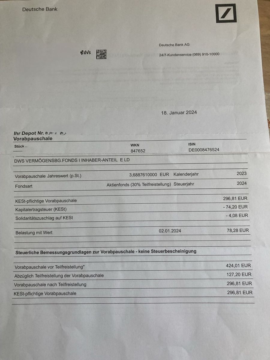 Also, Anfang 2024 hat die „Bank meines Vertrauens“ mir die Rechnung für die Vorab-Pauschale (in einem Dokument 1)für Fonds-Anteile mitgeteilt (und Kapitalertragsteuer und Soli auch abgeführt)