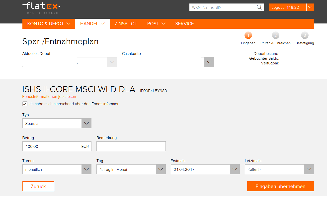Nun bin ich ein absolutes Greenhorn, was Börse und Aktien angeht, möchte aber gerne bei Flatex einen ETF Sparplan auf diesen MSCI World anlegen. Wenn ich das richtig verstanden habe, wird dann dort monatlich ein Anteil entsprechend meiner Sparrate gekauft. Muss ich dafür dann auch monatlich zahlen?
