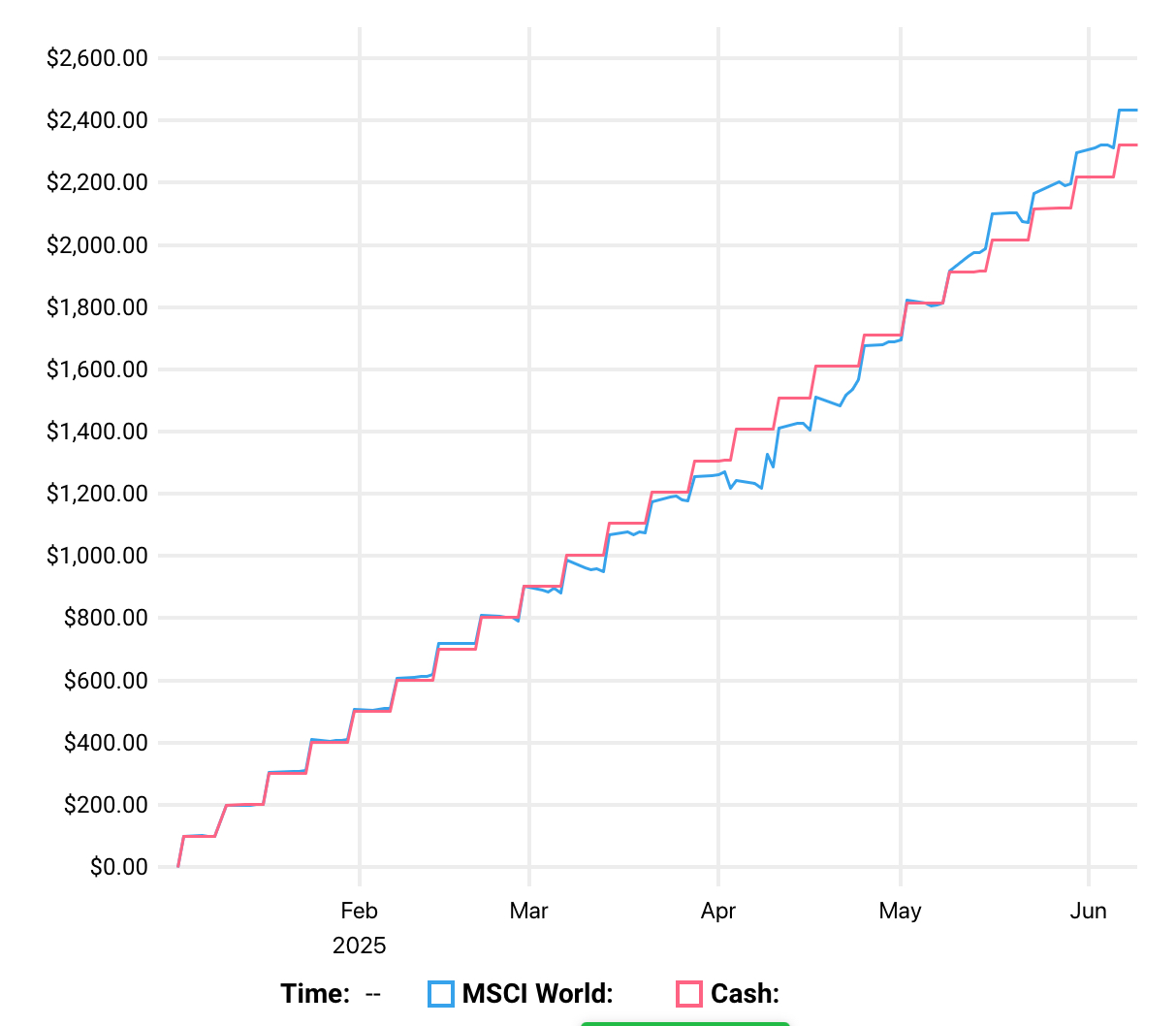 Es geht um die Frage, was ein Sparplan auf den MSCI World seit Januar 2025 bis jetzt gebracht hätte (monatlich z.B. 400 Euro oder wöchentlich 100 Euro).
