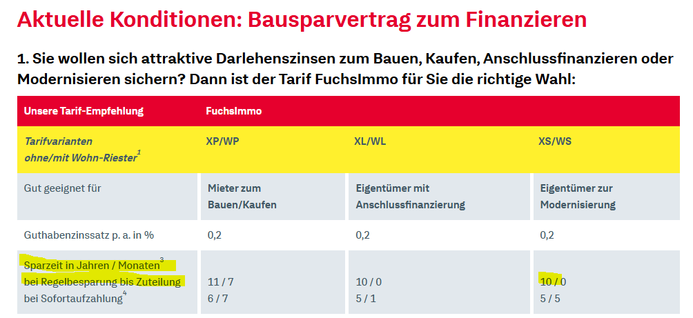 • BSV wäre der Schwäbisch Hall FuchsImmo XS. (1,6% Abschlussgebühr, 0,2% Zinsen in der Anschlussphase, 1,4% Zins fürs Bauspardarlehen)