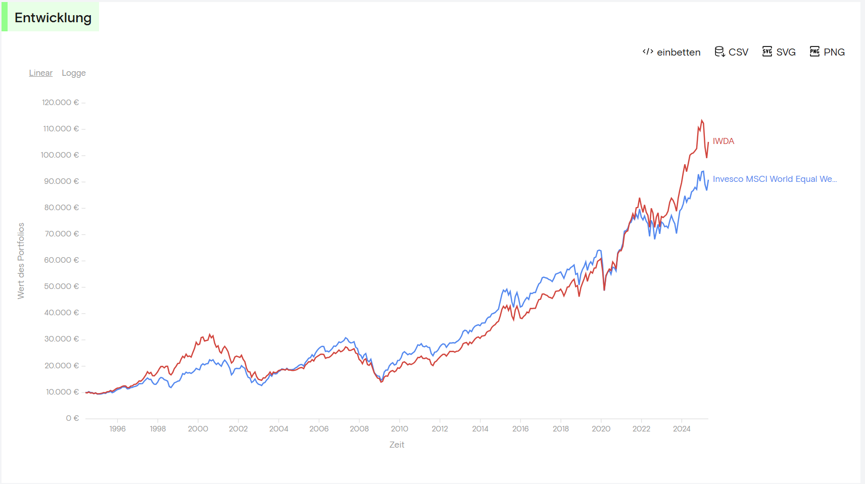 Hier z.B. MCAP MSCI World (rot) gegen gleichgewichtet (blau). Aktuell ist rot wieder vorne so wie 2000, wegen der Konzentration auf die Mag7. Aber auch das wird sich wieder ändern.