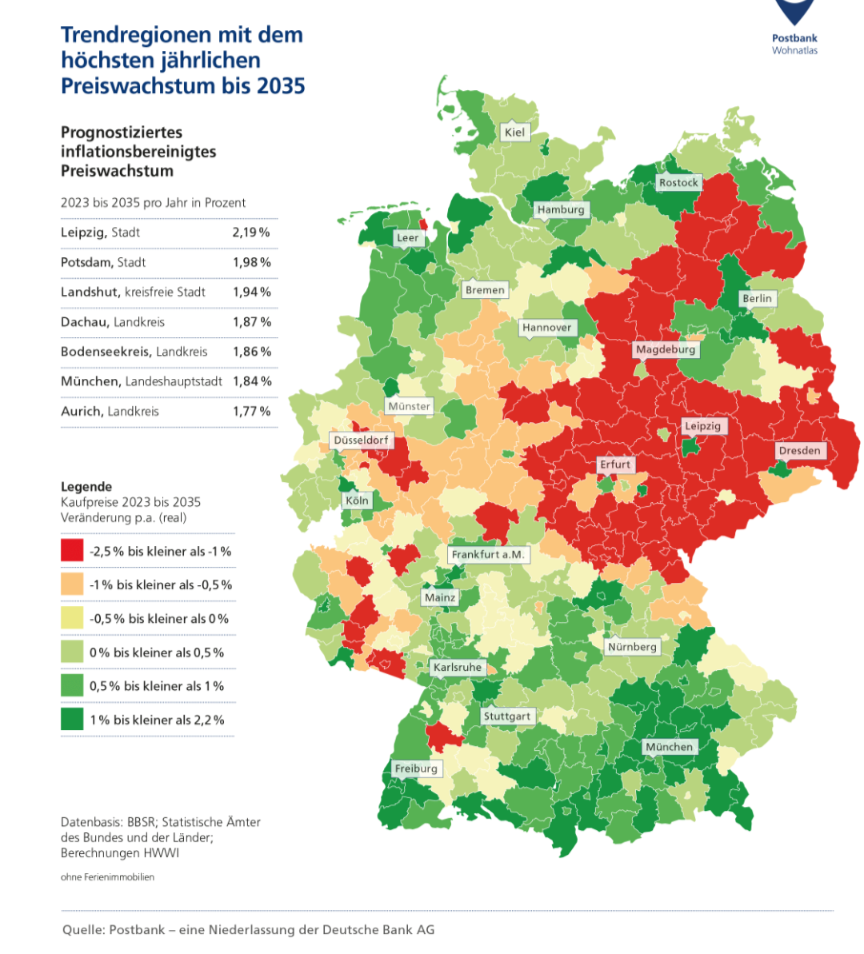 Kurz gegoogelt, die Postbank/Deutsche Bank hat die Entwicklung bis 2035 für die bundesdeutschen Landkreise prognostiziert, siehe Grafik.