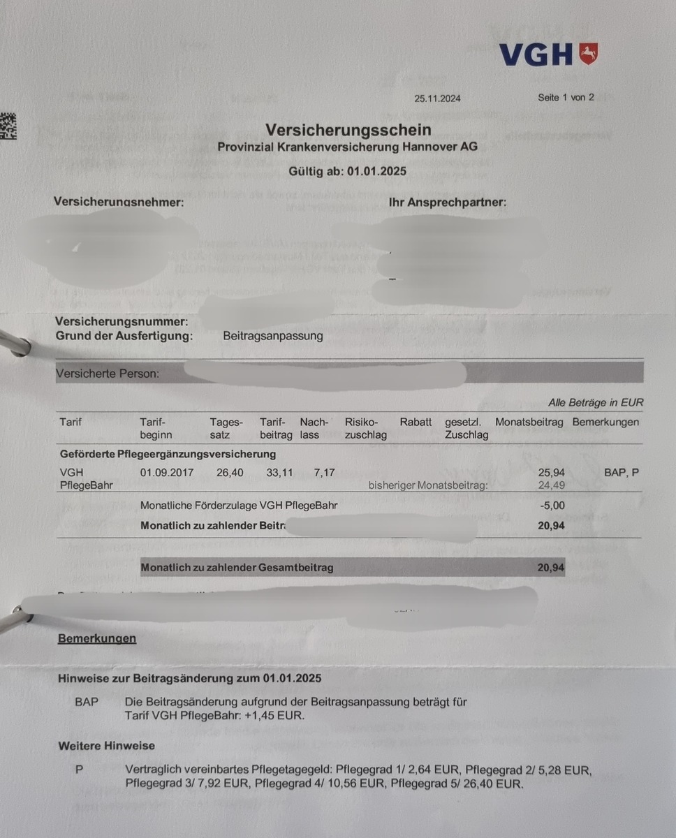 P.S.: im Falle einer Kündigung der Versicherung sind Eure bereits gezahlten Beiträge verloren bzw. kommen den übrigen Versicherten zugute. Bei einem Neuabschluss heute würde die Versicherung deutlich mehr kosten, weil Ihr 2017 noch acht Jahre jünger wart.