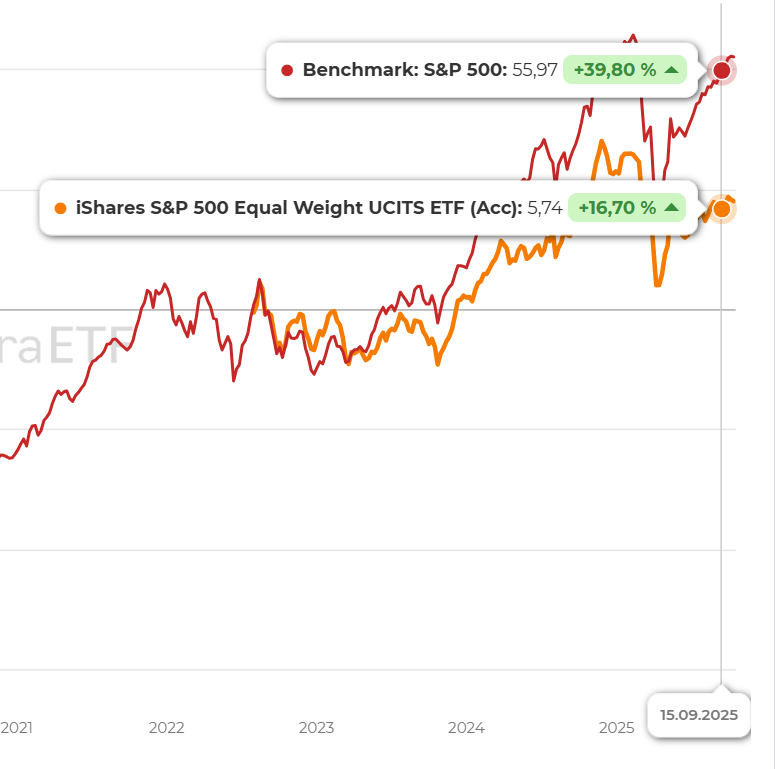 Obwohl im S&P 500 keine wirklichen Leichtgewichte sind, sieht man schon einen deutlichen Unterschied in der Rendite. Bei einem All World ETF mit über 2000 Unternehmen aus der ganzen Welt dürfte die Differenz zwischen MCAP und Equal Weight noch deutlich größer sein.