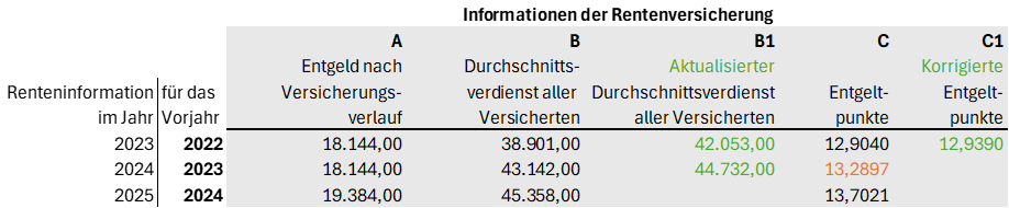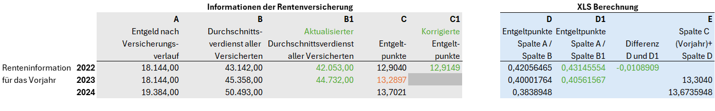 In grau die Fakten aus der Renteninformation und Versicherungsverlauf. In blau meine Berechnung in Excel, wie kommt es zu der Differenz (rot?).