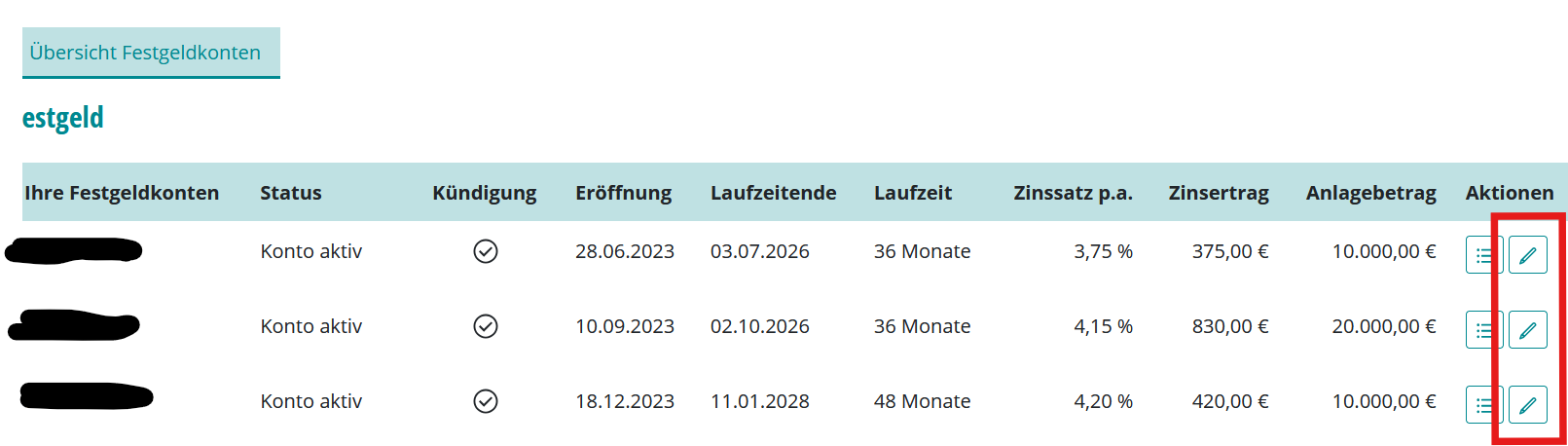Einfach auf den Stift (rot gekennzeichnet) gehen und im nächsten Bild die Kündigung bestätigen. Anschließend bekommt man ins Postfach das von mir im Vorfeld schon bekanntgegebene Kündigungsschreiben zugestellt. Ich kann leider den ungekündigten Zustand nicht mehr anzeigen, da meine Festgelder sofort nach Vertragsbestätigung von mir auch gekündigt werden. Dies geht selbstverständlich nur mit Wirkung zum regulären Laufzeitende.