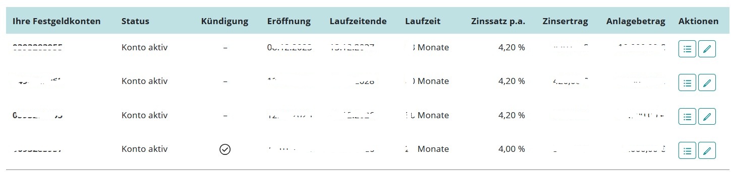 Einfach auf den Stift (rot gekennzeichnet) gehen und im nächsten Bild die Kündigung bestätigen. Anschließend bekommt man ins Postfach das von mir im Vorfeld schon bekanntgegebene Kündigungsschreiben zugestellt. Ich kann leider den ungekündigten Zustand nicht mehr anzeigen, da meine Festgelder sofort nach Vertragsbestätigung von mir auch gekündigt werden. Dies geht selbstverständlich nur mit Wirkung zum regulären Laufzeitende.