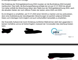 Die Hausgeldabrechnung 2024 wurde vom neuen Verwalter vollständig neu gebucht; für mich ergibt sich aus 2024 sogar ein Guthaben. In den Jahren 2021–2023 hätte ich nach bisherigem Stand aber eher eine Nachzahlung von insgesamt rund 1.800 € welche ich aber nicht nachvollziehen kann wegen der fehlenden Unterlagen und die Abrechnungen sind jedoch noch nicht wirksam beschlossen worden. In der kommenden ETV (Morgen um 15Uhr) soll nun die Abrechnung 2024 beschlossen und außerdem über diesen „Schnitt“ ab 01.01.2024 entschieden werden.