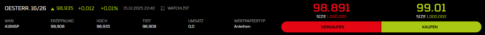 letzter Kurs etwa 98,897%; einen aktuellen Kurs gibt es nicht, die Börse ist ja geschlossen.