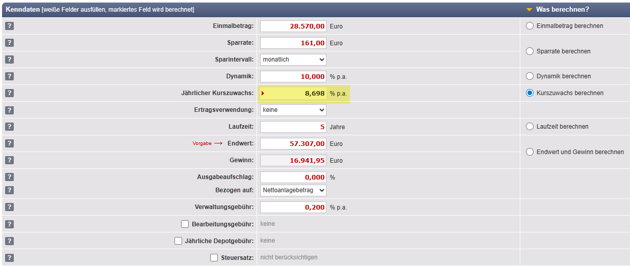 Über Fondsweb kannst Du auch Sparpläne simulieren. Mit so einer Sparplansimulation kannst Du dann ermitteln wie hoch die reine Fondsrendite über 5 Jahre gewesen wäre. Also, als wenn Du Deine Beiträge direkt in die Fonds eingezahlt hättest.