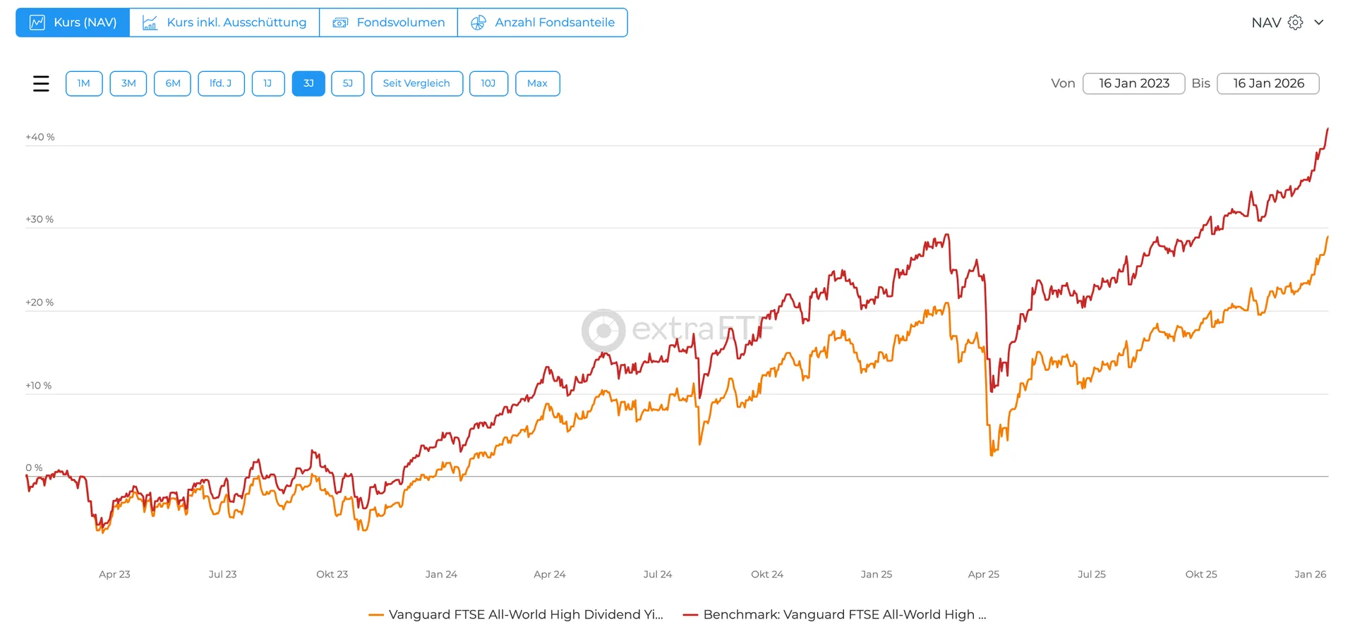 • Ein Beispiel. Vergleicht man den Vanguard FTSE All-World High Dividend Yield ETF in seiner ausschüttenden (A1T8FV) bzw. thesaurierenden Variante (A2PLTB), dann kann man den Effekt der Ausschüttung schön beobachten: