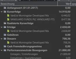 • Ich kann die Datenreihe aufgrund dessen dass der Vaneck etf erst Mitte 2016 gestartet ist, leider nicht noch weiter in die Vergangenheit datieren, weswegen ich das erste volle Geschäftsjahr 2017 gewählt habe. Die Berechnung basiert auf real Daten. Da ich diese nun angelegt habe, kann ich jederzeit wieder darauf zurückgreifen und muss nur die Dividenden nachtragen, ich könnte auch einmal Käufe in Höhe der Ausschüttungen buchen, oder beim vanguard einen Verkauf für die vap (was aber deutlich aufwendiger ist wegen fifo) dass war mir aber beim anlegen der datenreihe heute Abend schlichtweg viel zu aufwendig.
