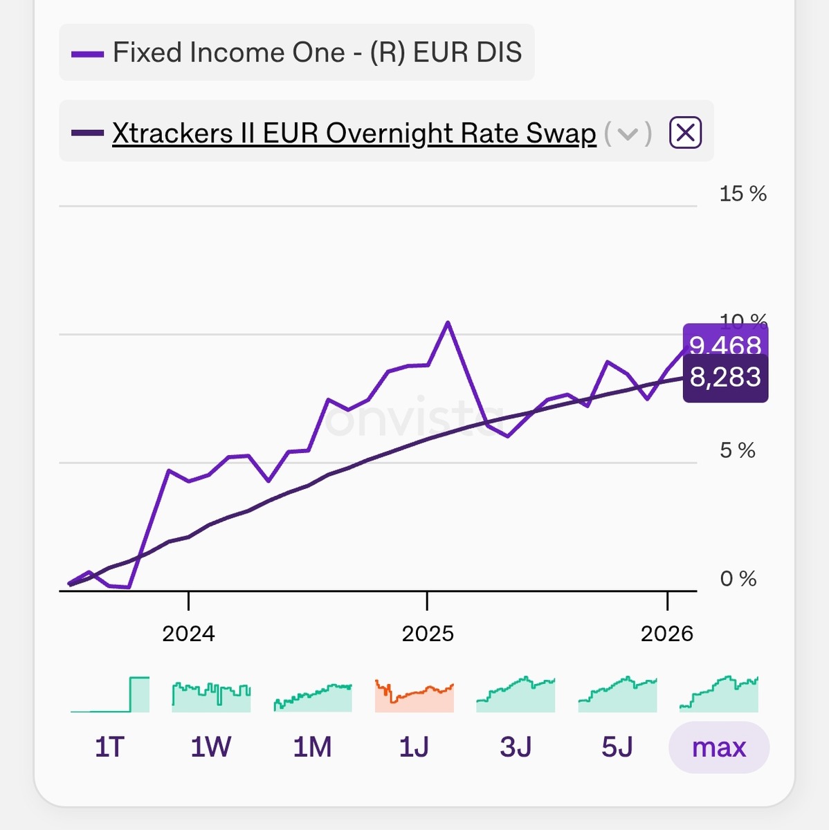 Ich halte daher bislang den Sicherheitsteil meines Portfolios entweder auf Tagesgeldkonten oder dem DBX0AN. In einer längeren Betrachtung rentiert dieser nur knapp unter bspw. dem Fixed Income One bei deutlich geringeren Schwankungen:
