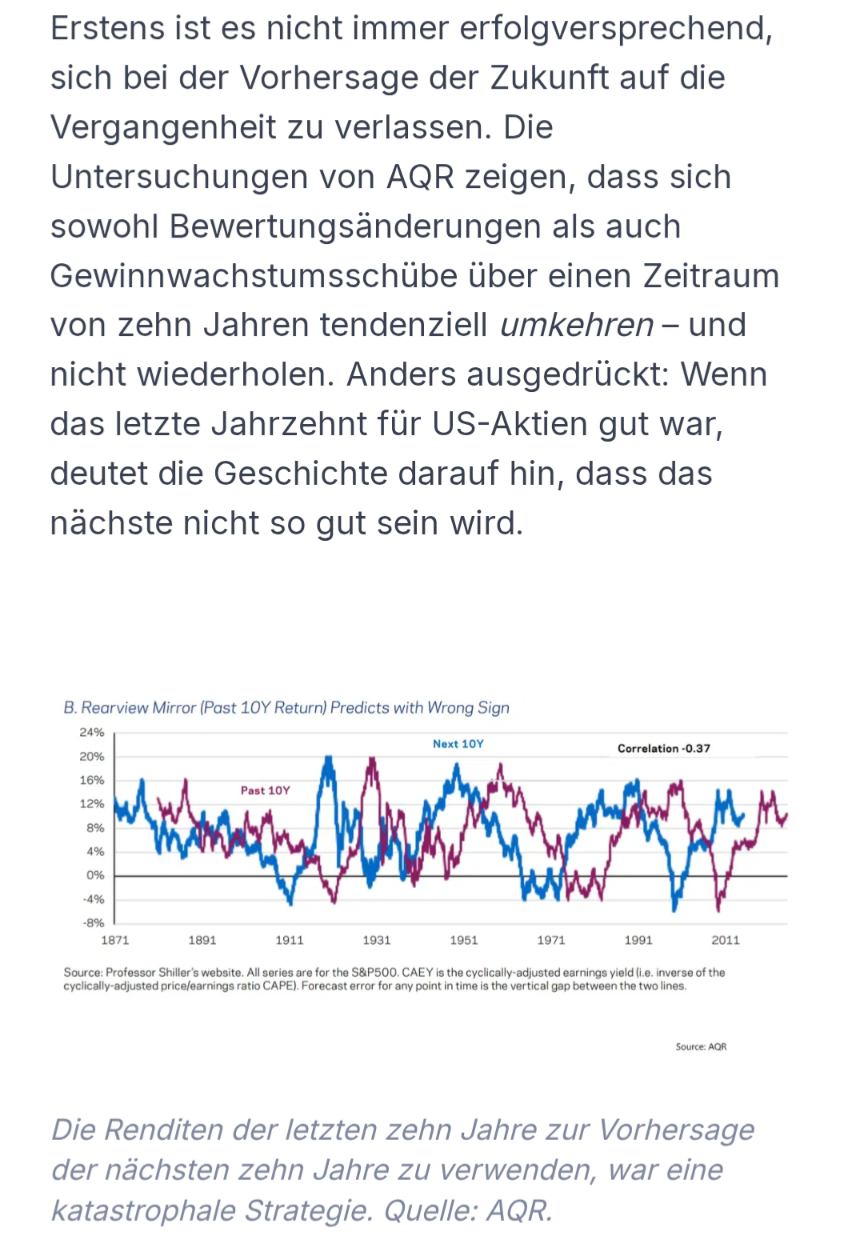 Du zitierst irgendeine Veröffentlich einer Firma namens AQR die tatsächlich behauptet, wenn ein Jahrzehnt für Aktien aus bestimmten Ländern (in diesem Fall den USA) besonders gut war, dann wird das nächste Jahrzehnt für solche Anleger voruassichtlich eine "Katastophe".