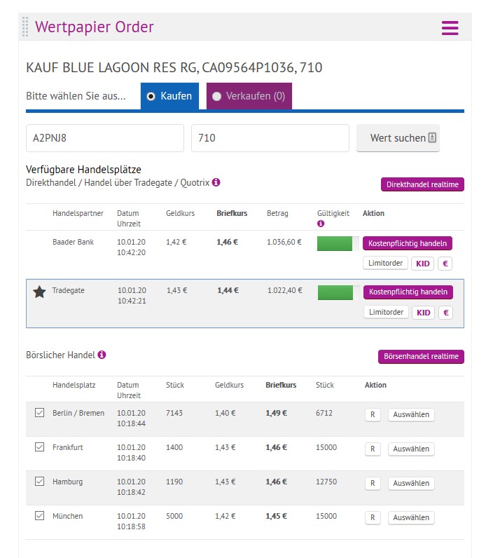 Ich hab ja da eine Auswahlmöglichkeit bei wem ich handele (Auswahl des Handelsplatzes), wie z.B. Frankfurt, Baader Bank, Commerzbank, Quotrix, Xetra usw.