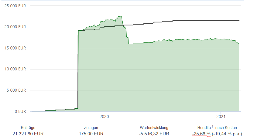 wenn ich jetzt meinen Riester-Mist bei Sutor kündigen würde, würde ich Verlust machen. D.h. nach Abzug der Zulagen und Steuererstattung würde ich weniger zurück erhalten, als ich tatsächlich von meinem Geld netto einbezahlt habe.