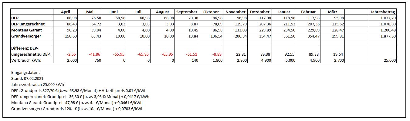 Verglichen habe ich die Kosten von: DEP (das Original mit starrem Basispreis), DEP-umgerechnet (Grundpreis in Arbeitspreis umgerechnet), Montana Garant und einen Grundversorgertarif.