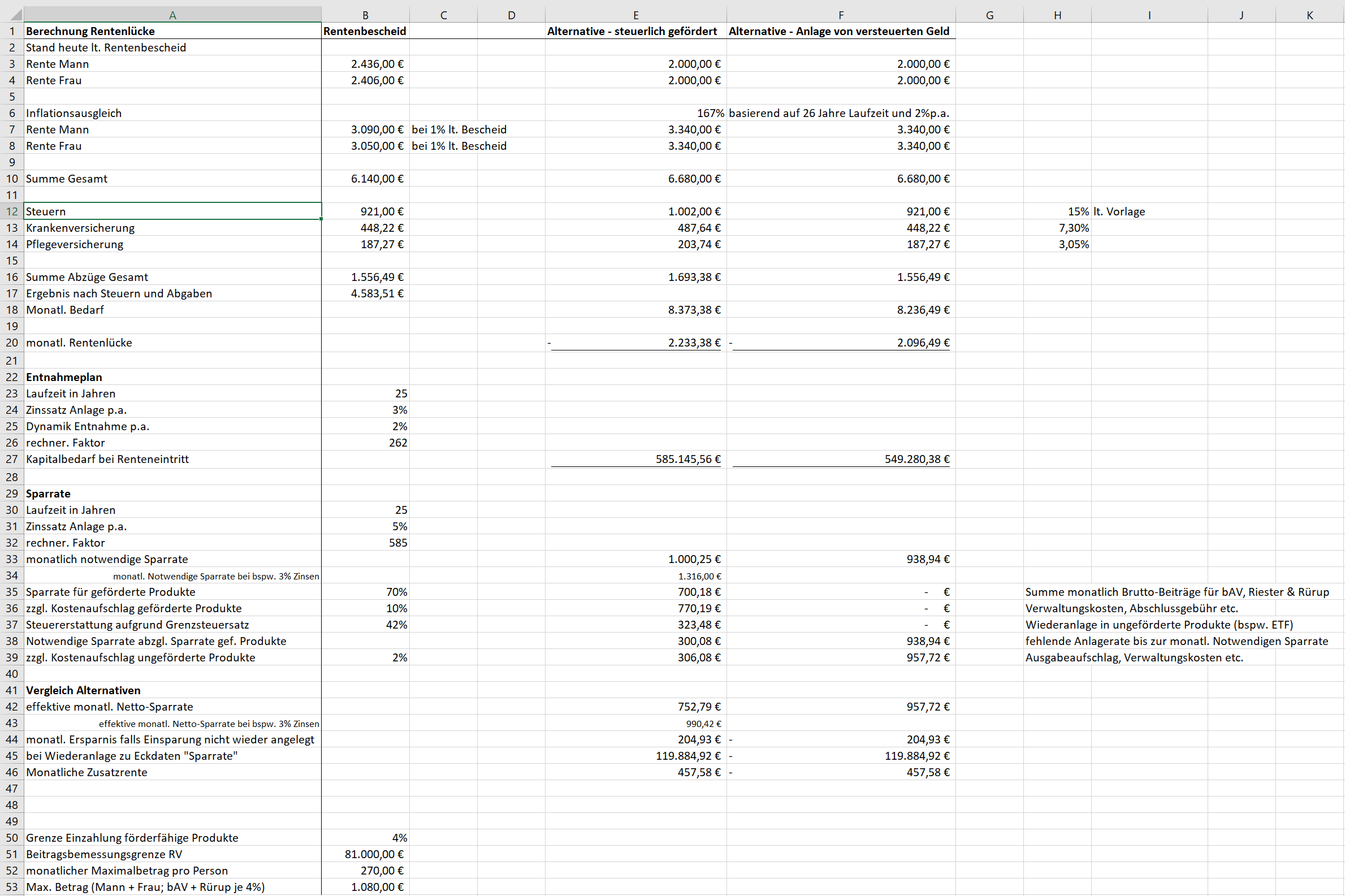 Im Ergebnis (und unter der Voraussetzung, dass die Einkommenssituation so bleibt) würde man so mit dem Einsatz von ca. 750,- € / Monat diese Lücke füllen. Rein rechnerisch entspricht das einem Fondssparplan von 7,5% (25 Jahre Laufzeit, 750,-€ monatl. Einzahlung ohne Kapitalertragssteuern). Weiterhin wäre das Risiko entsprechend gestreut und man kann Teile davon auch für unvorhergesehene Dinge nutzen. Rürup ist eine feste Rentenzahlung, der Einfachheit halber aber hier nicht gesondert behandelt da im Ergebnis vergleichbar.