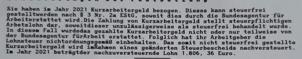 Hallo, mein Onkel hat einen korrigieren Steuerbescheid für 2021 bekommen und muss jetzt 500 Euro Steuern nachzahlen. Er hat in dem Jahr Kurzarbeitergeld bezogen, welches er alles korrekt angegeben hat bei seiner Erklärung 2021. Jetzt kommt die Aufforderung zur Nachzahlung. Soweit ich es verstehe hat das Arbeitsamt das Kurzarbeitergeld nicht ganz erstattet und somit war es fälschlicherweise steuerfrei gestellt und jetzt muss auf einen Teil davon Steuer nachbezahlt werden. Mein Onkel ist jetzt in Altersteilzeit und hat eigentlich keine Verbindung mehr zu seinem früheren Arbeitgeber. Sollte er da mal nachfragen? Danke