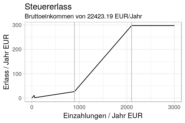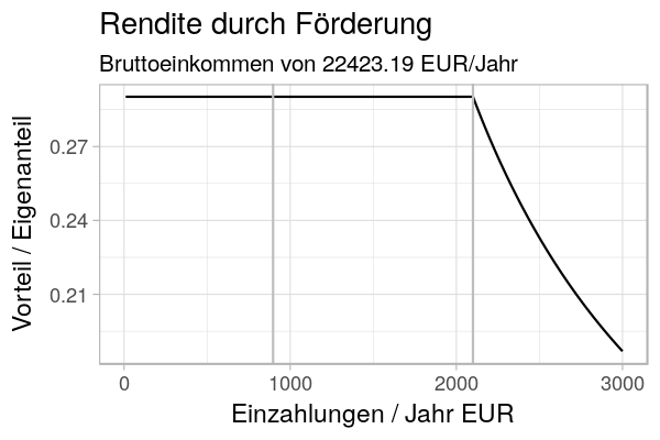 Die Plots kommen aus diesem R Skript. Ich nehme an, dass ich die nächsten drei Jahre 22000 EUR brutto verdiene und danach 55000 EUR. Ich zahle dann immer 4% ein und nehme entweder Förderung oder Steuervorteil mit. Die ganzen Kosten habe ich entsprechend mitgerechnet.